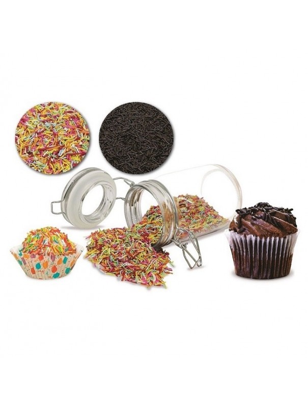 Granillos de azúcar de colores y de chocolate, se utilizan para decorar fruta con chocolate, panadería y repostería.
